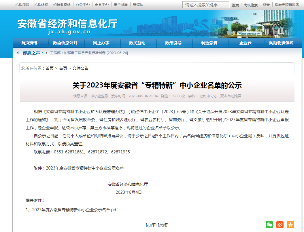 安徽M6米乐 M6 冷热综合能源有限公司被认定为安徽省“专精特新”中小企业