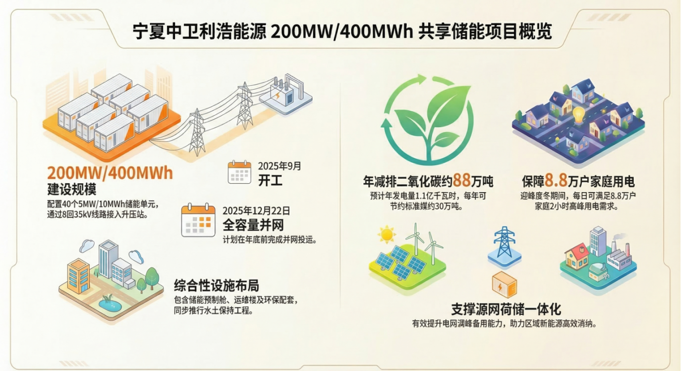 宁夏中卫共享储能项目(M6米乐 M6 冷热实施项目:200MW/400MWh,年发电量1.1亿千瓦时,省煤30万吨,减排88万吨,保障8.8万户高峰用电。
