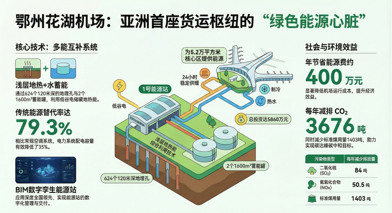 鄂州花湖国际机场能源站项目(M6米乐 M6 冷热参与项目):冬季以浅层地热为核心,水蓄能+调峰燃气锅炉保障稳定供热;夏季靠浅层地热+水蓄能供冷,调峰冷水机组按需补能,实现清洁高效供能。